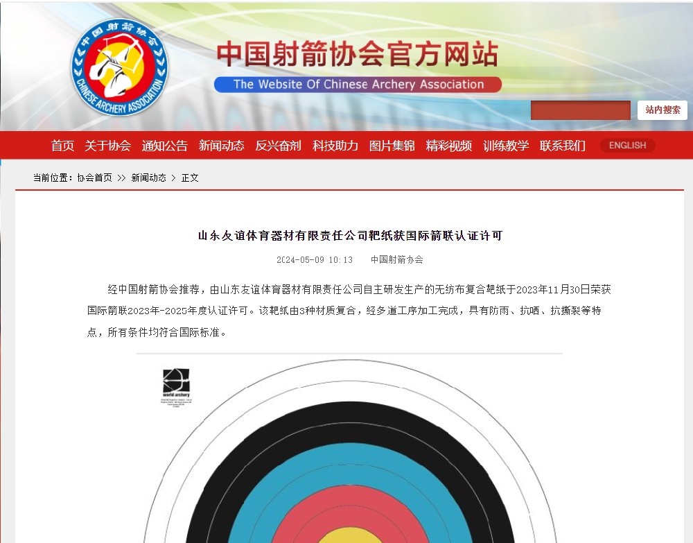 目前,主要生產和銷售射箭比賽及訓練專用器材,包括:箭靶、靶紙、靶架、號碼牌、風向旗、計時記分器等場地器材設備;反曲弓、復合弓、傳統(tǒng)弓、瞄準器、防震桿等弓箭裝備;箭壺、護胸、護臂、護指等各類箱包護具。公司所生產的射箭器材已通過國際射箭聯(lián)合會及中國射箭協(xié)會CAA認證。